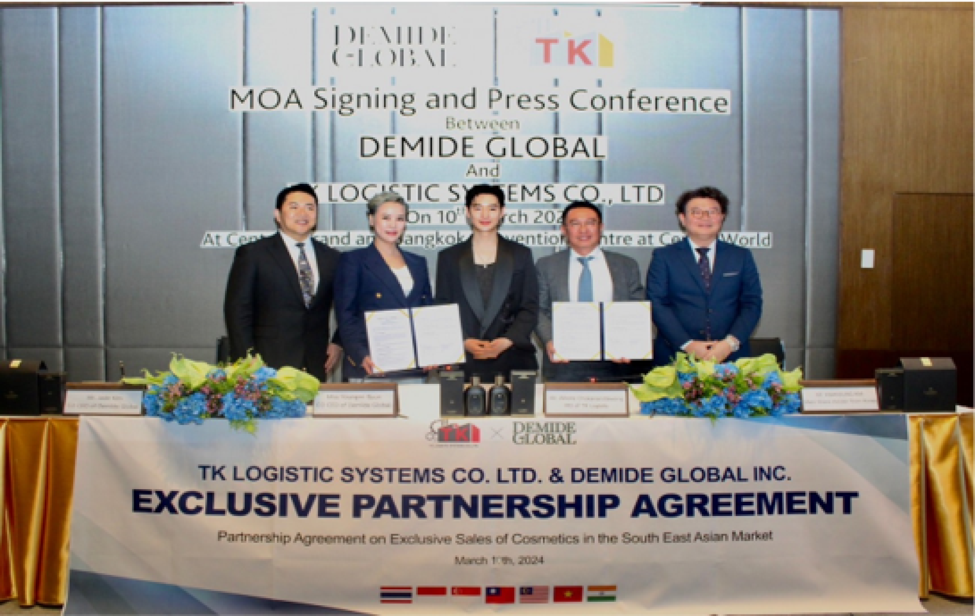 เมื่อวันที่ 10 มีนาคม 2567 บริษัท TK Logistic Systems จำกัด ได้ประกาศการลงนามข้อตกลงความร่วมมือกับ Demide Global Inc. ซึ่งเป็นผู้นำระดับโลกที่มีชื่อเสียงด้านการผลิตและจำหน่าย เครื่องสำอางพรีเมียม จากประเทศเกาหลีใต้